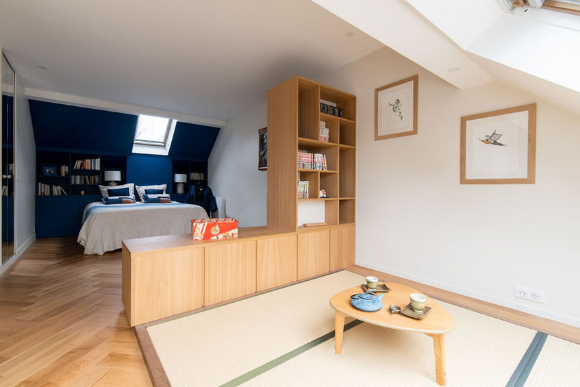 La cuisine est ouverte sur la pièce à vivre dans l’esprit des paravents japonais, avec structure en bois , à la manière de Tao Ando. La suite parentale, très grande, est aménagée en 2 zones, séparées par un meuble sur mesure: un espace tatami, baigné de lumière et l'espace nuit, niché dans la bibliothèque créée dans la sous-pente du toit. La salle de bain, inspirée des bains japonais OFURO, accueille un espace douche et bain en bois dans une ambiance ultra zen, où tout est calme, douceur et volupté...